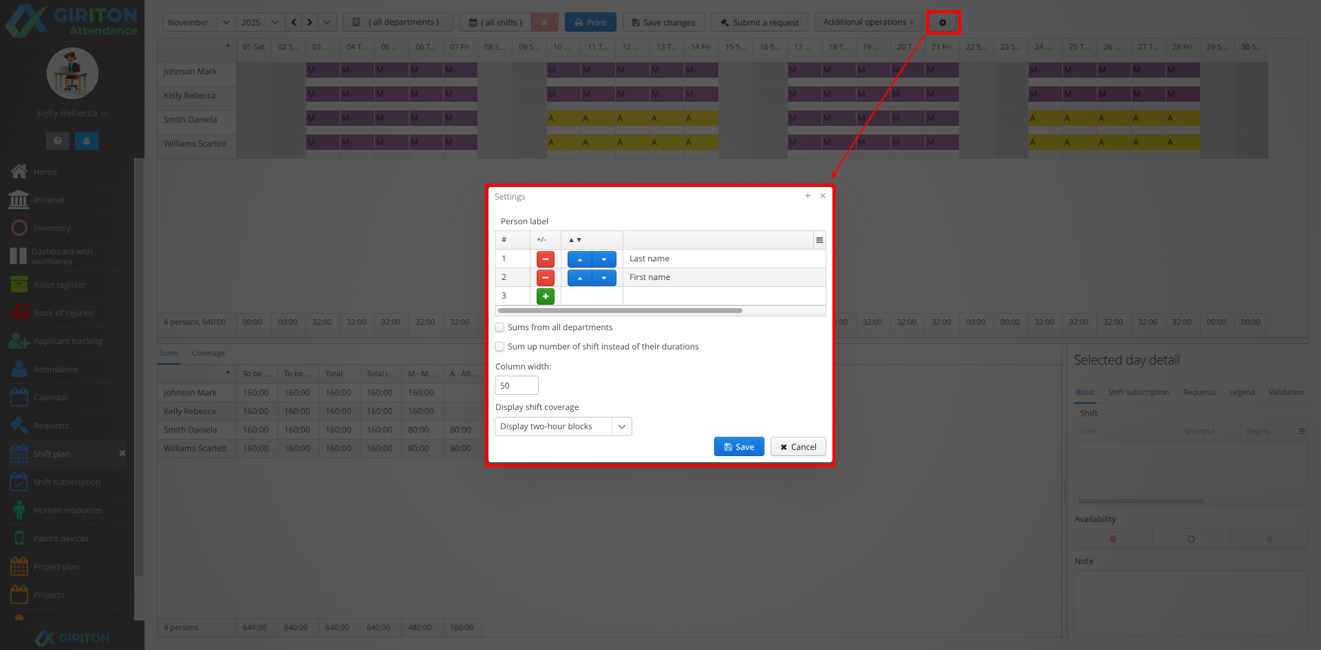 - Person description - besides the first and last name, it displays additional information (e.g., User number or Employment type). After closing and reopening the Shift Plan, the required information will be displayed in the list of persons.