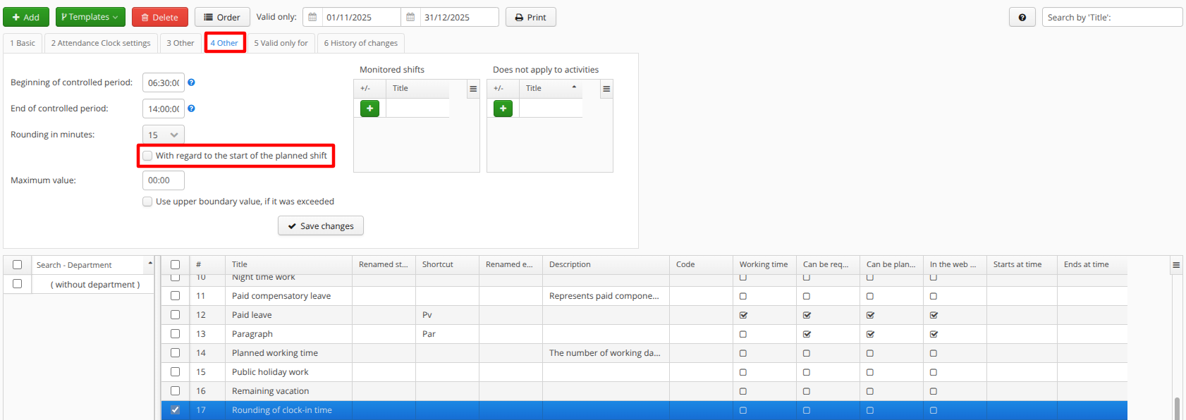 If you do not want to round to the nearest quarter hour, half hour, etc., but want to round according to the start or end time of the shift, check With regard to the start of the planned shift.