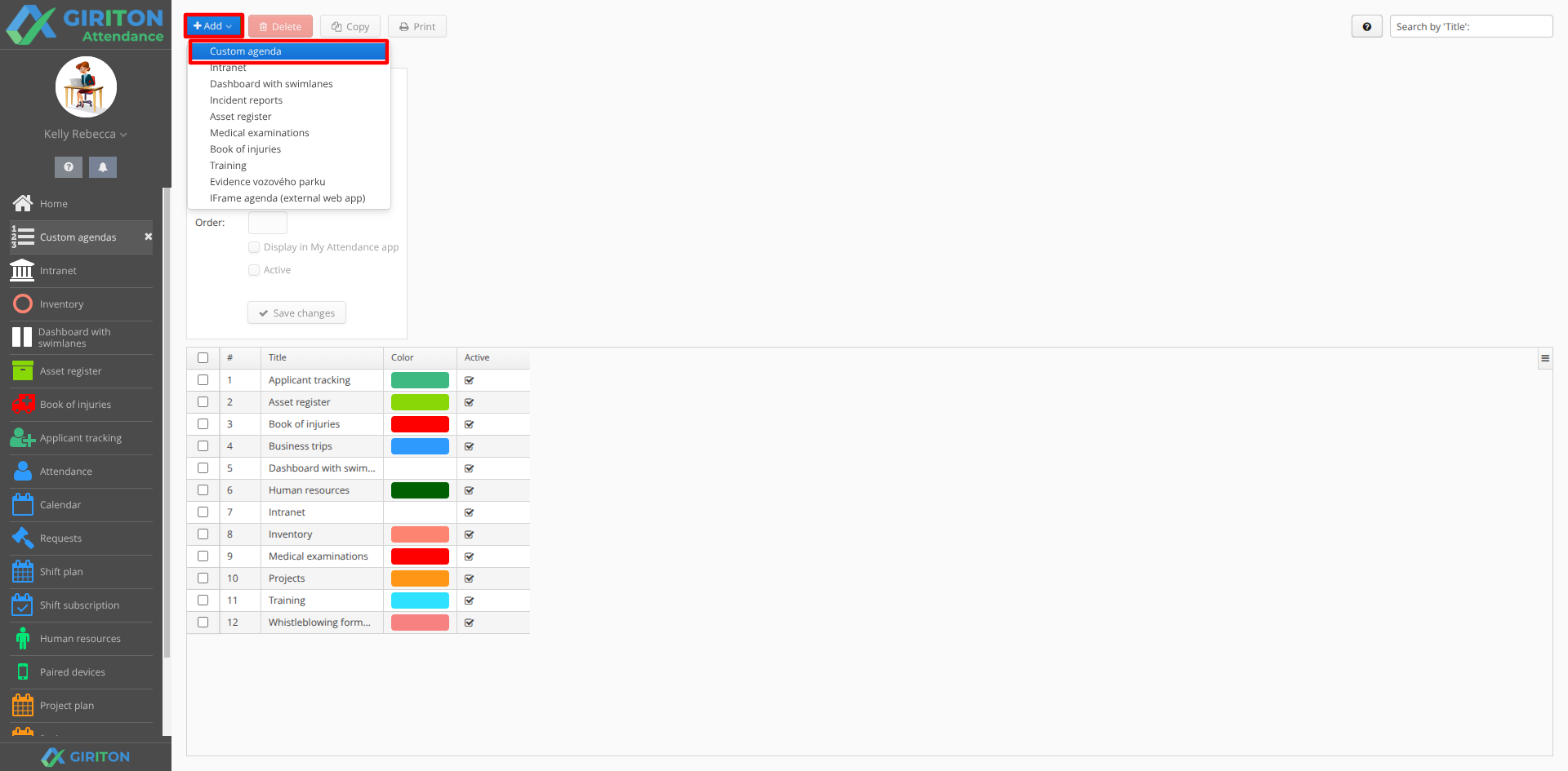 NOTE: In the Add menu there is also an option for iFrame agenda (external web application), these are described in a separate chapter here.