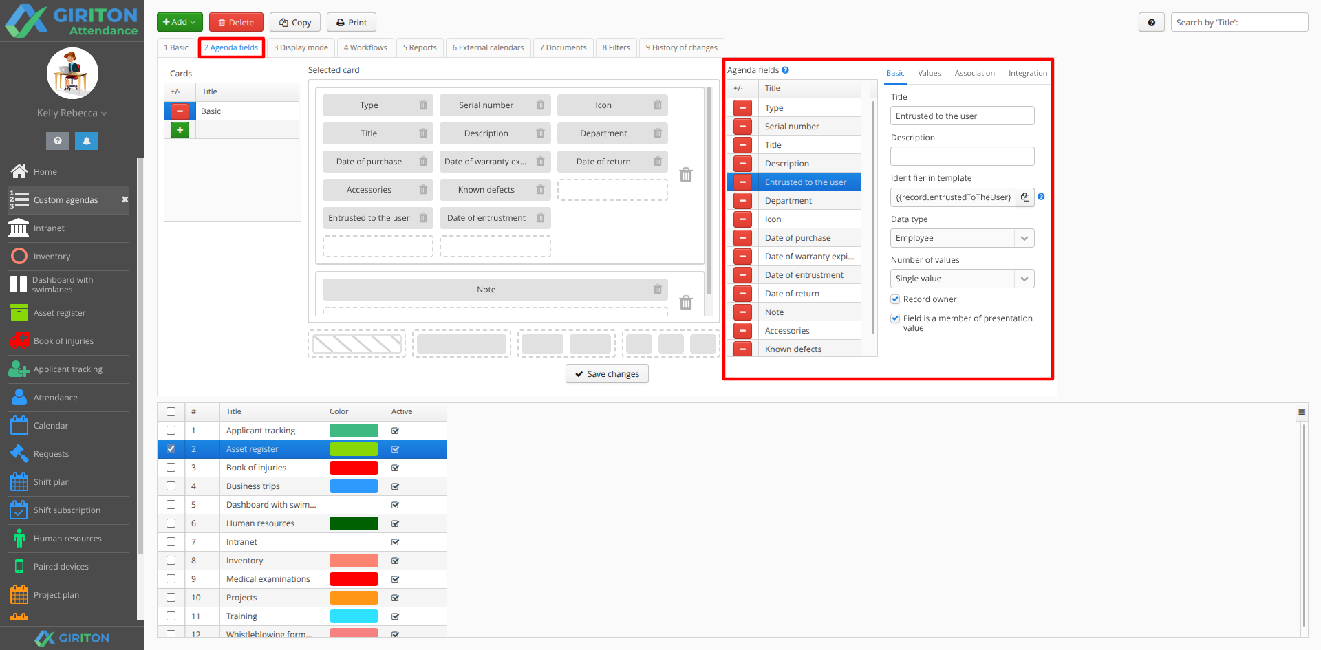 EXAMPLE: The Asset Register agenda has fields "Holder" (employee type), "Name" (text type), "Type" (text type, with predefined values: Mobile, Notebook, Vehicle) and others.