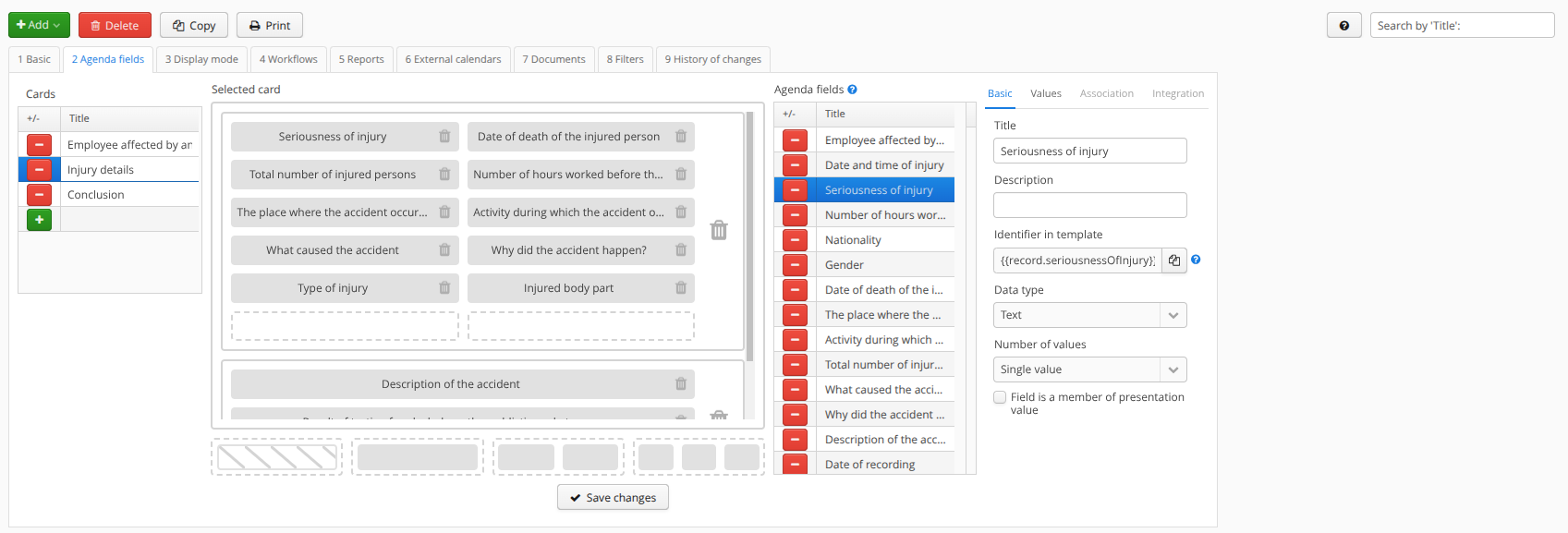 You can check the "Field is part of the record description" option for the field. Then, when the record for this agenda is displayed elsewhere in the application (for example, in a list in a drop-down box), the values of the fields that have this option turned on will be displayed. For example, for the Injury Book, you enable this option for the Date and Injured Employee fields. Elsewhere in the application, records such as 2023-08-01 John Smith will appear in the list of injuries.