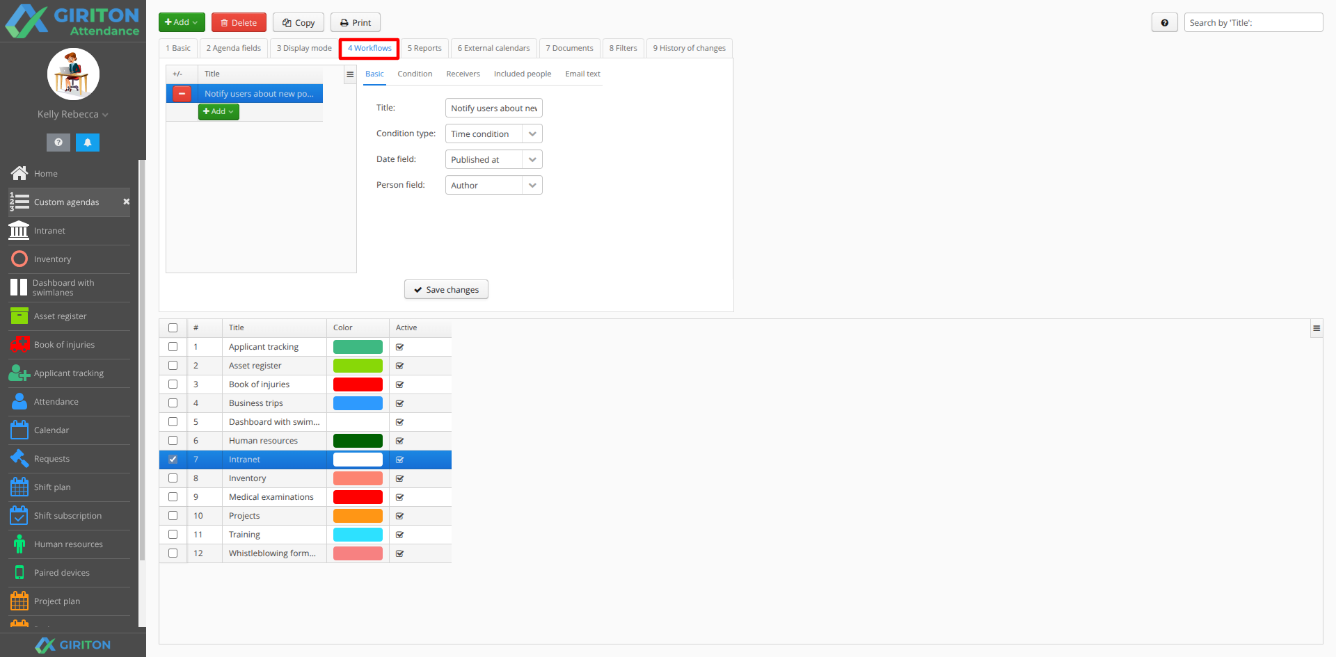 You can add notifications to each agenda in the Workflows tab. For example, the Intranet agenda will benefit from a workflow that sends you notification to let your employees know when the new post in Inranet agenda is posted.