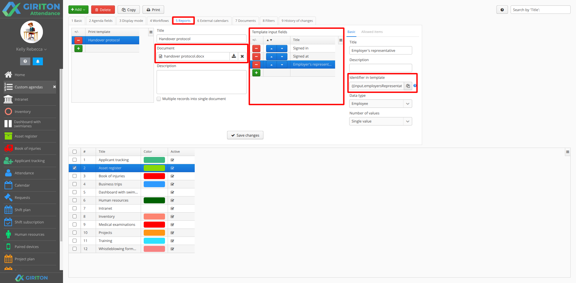 For each agenda, you can upload your own Word documents as templates for print reports in the Reports tab. You can use Field Identifiers in these Word documents, for example, so {{record.datecollege}} and the system will then populate your Word document with the Giriton data for that record at the time of export. For more information, see the chapter on creating documents.
