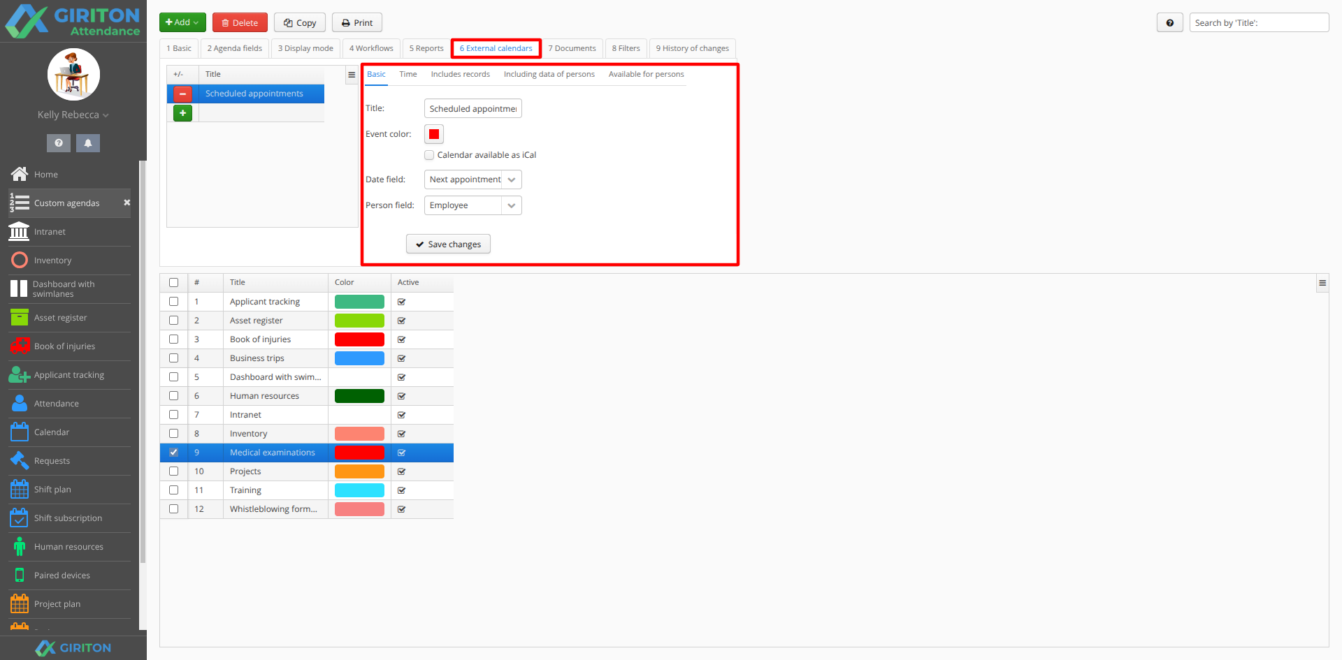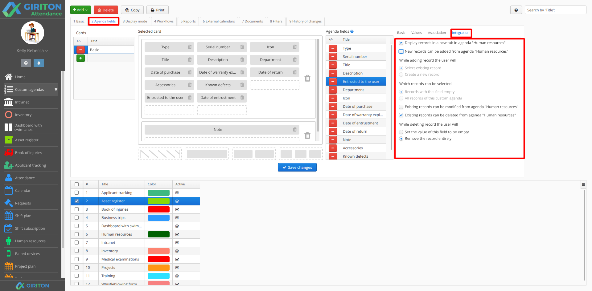 In the User menu - Manage - Custom Agendas menu, select the particular agency whose records you want to see in HR. On the Agenda Fields tab, select the Employee type field (for example, in Property Records, it will be the "Holder" field) and then on the Integration tab to the right, turn on the View Agenda Records option in HR. When you now open the HR agenda, you will also see the tabs "Property records", "Medical appointments" and "Accident book", where you will always see only the records for the currently selected user.