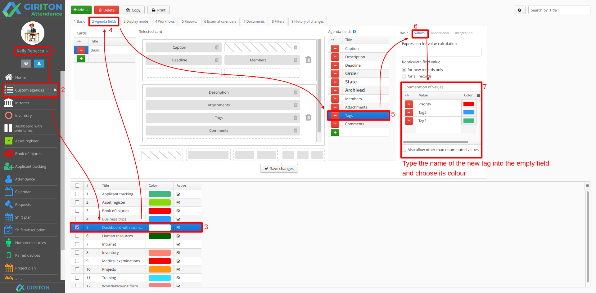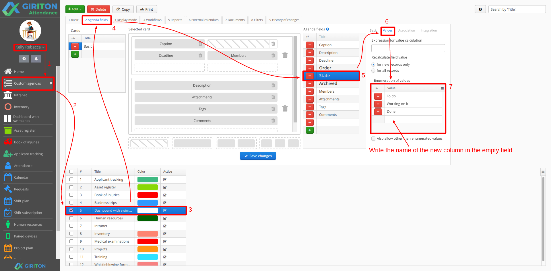 - Here you can create new fields, rename them or change their values, for more see help Agenda fields.