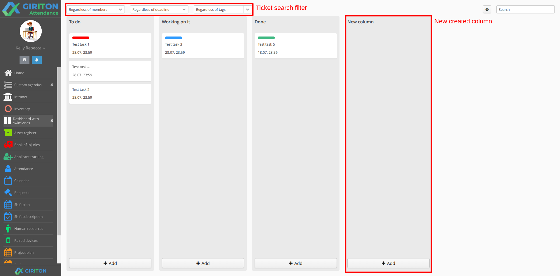 Agenda Dashboard with swimlanes gives us the ability to create a bulletin board where we can create our own tickets, change their status by assigning them to columns and sort them as needed.