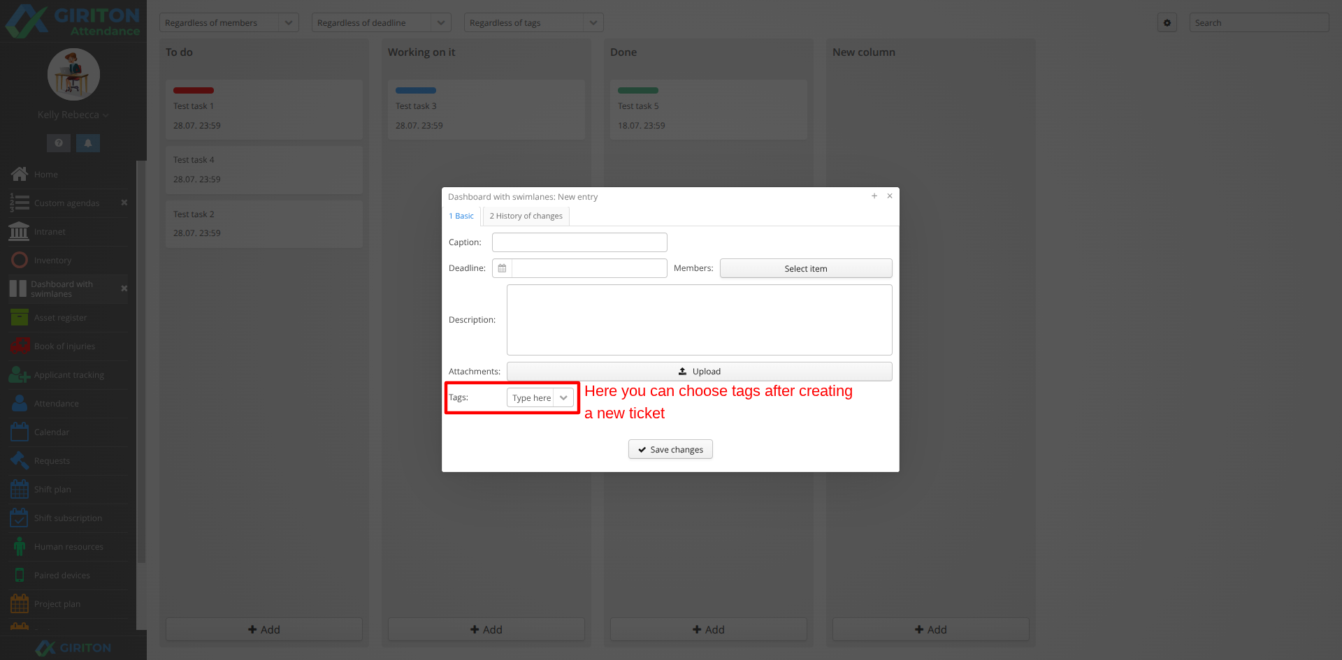 To add new tags or edit existing ones, go to their settings via User Menu (Your name) - Configuration - Custom Agendas - Dashboard with swimlanes - Agenda fields - Tags - Values.