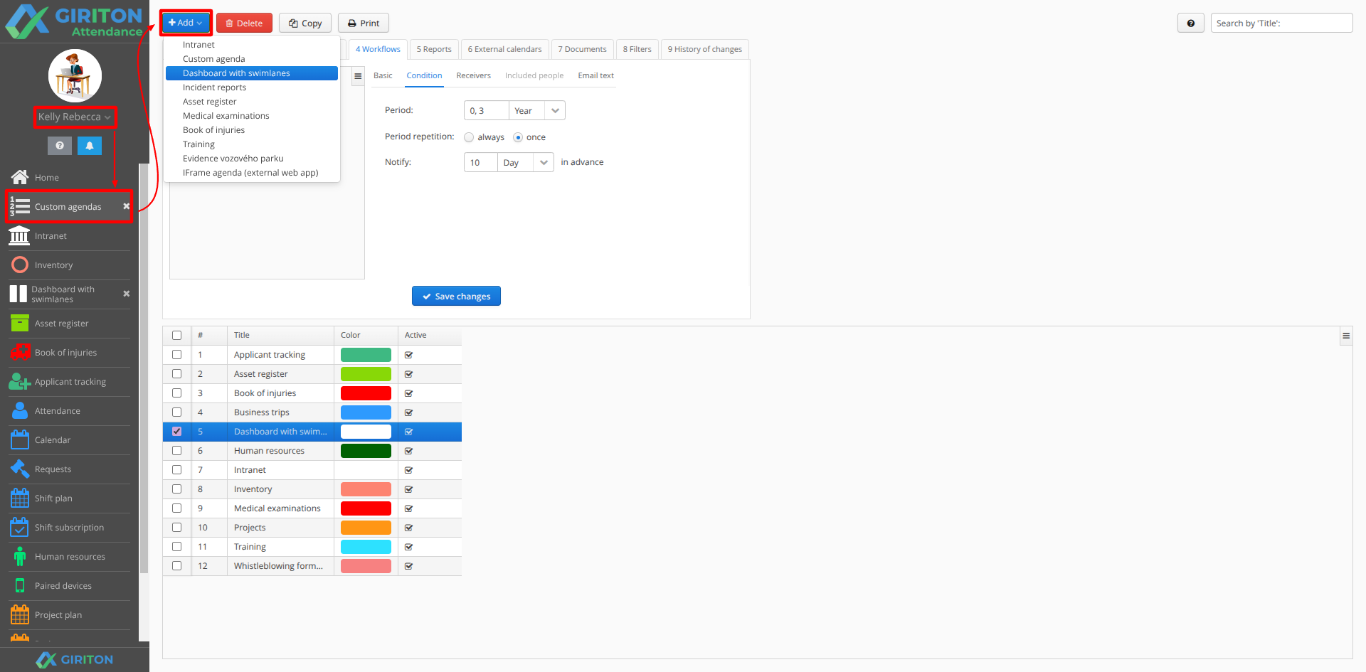 - To set up notifications, go to their settings via User Menu (Your name) - Configuration - Custom Agendas - Dashboard with swimlanes - Workflows.